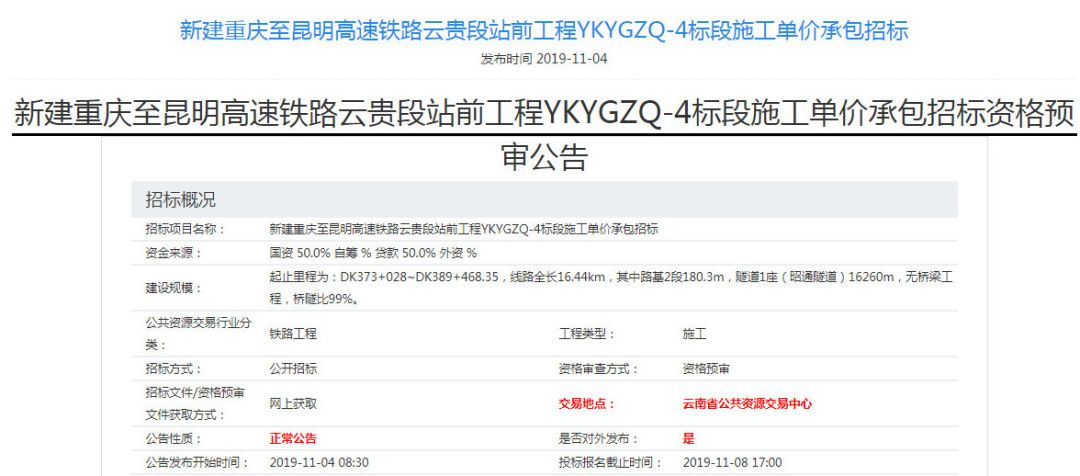 11月4日,沪昆铁路客运专线云南有限责任公司发布了《新建重庆至昆明高速铁路云贵段站前工程YKYGZQ-4标段施工单价承包招标资格预审公告》。