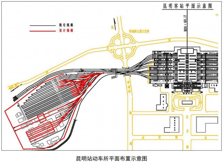 将昆明站现有机辆设施改动车组检修、存放设施。昆明站动车运用所规模为:将客整所咽喉既有6号对称道岔局部改建为9号道岔,挂网改造既有普客整备线线条临修线,布置形式详见下图。